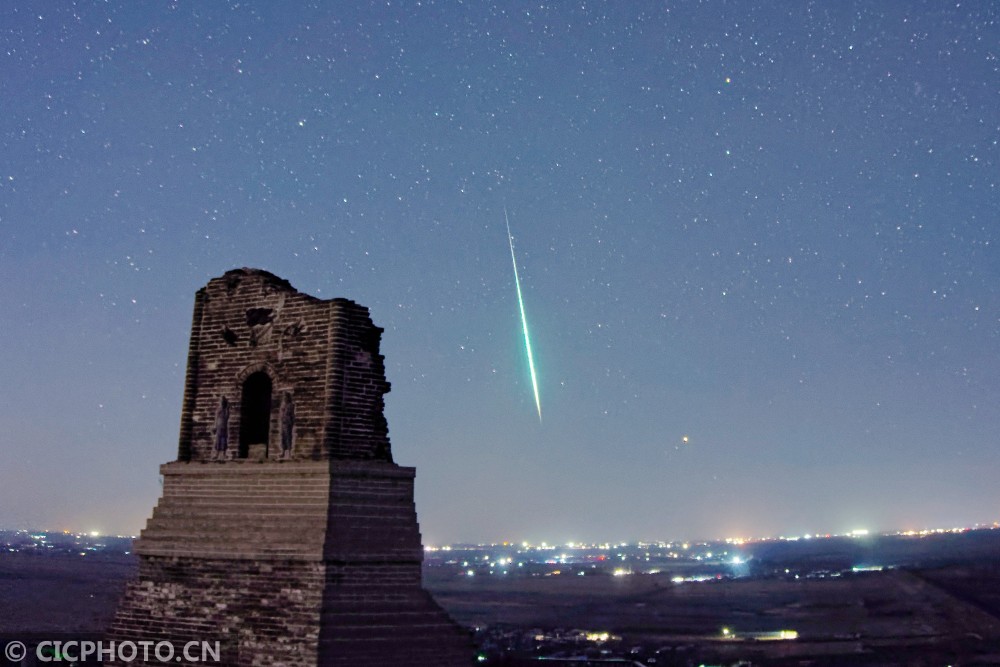 ↑2020年12月14日,辽宁沈阳七星山,火流星划破夜空,掠过饱经沧桑的佛塔,指向地平线上的万家灯火。CICPHOTO/弋其正 摄