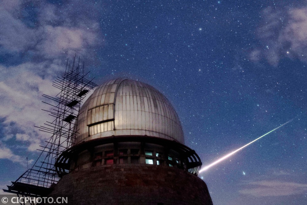 ↑2020年8月12日,江苏盱眙县,一颗英仙座群内火流星直冲近地天体望远镜圆顶。CICPHOTO/刘浩 摄