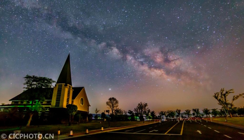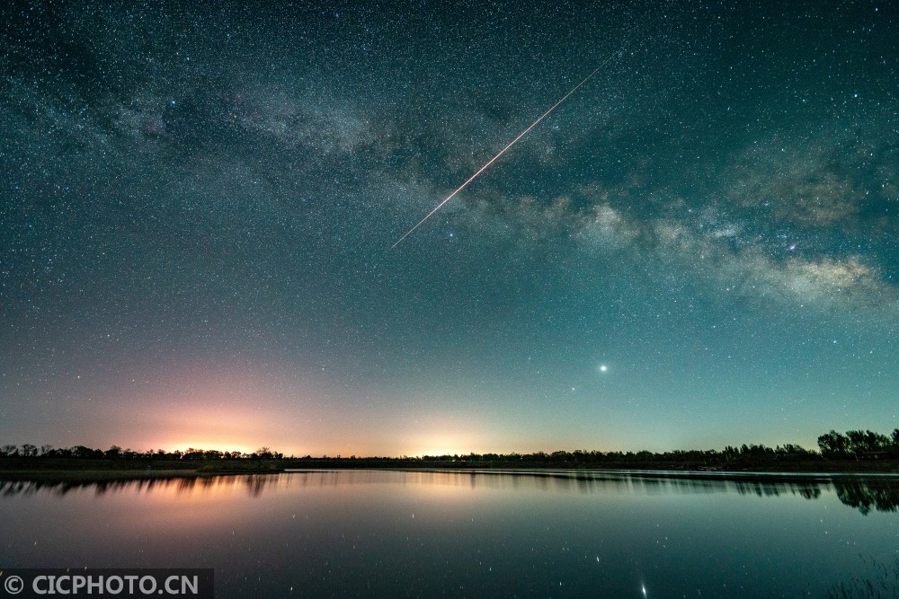 ↑2020年4月29日,江苏盱眙县,凌晨2点银河从天泉湖上升起。CICPHOTO/张健 摄