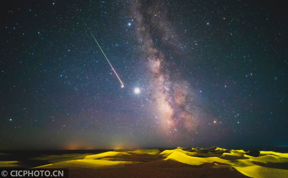 ↑2020年8月12日,内蒙古阿拉善,英仙座流星雨之夜大漠流星。CICPHOTO/荣丽山 摄