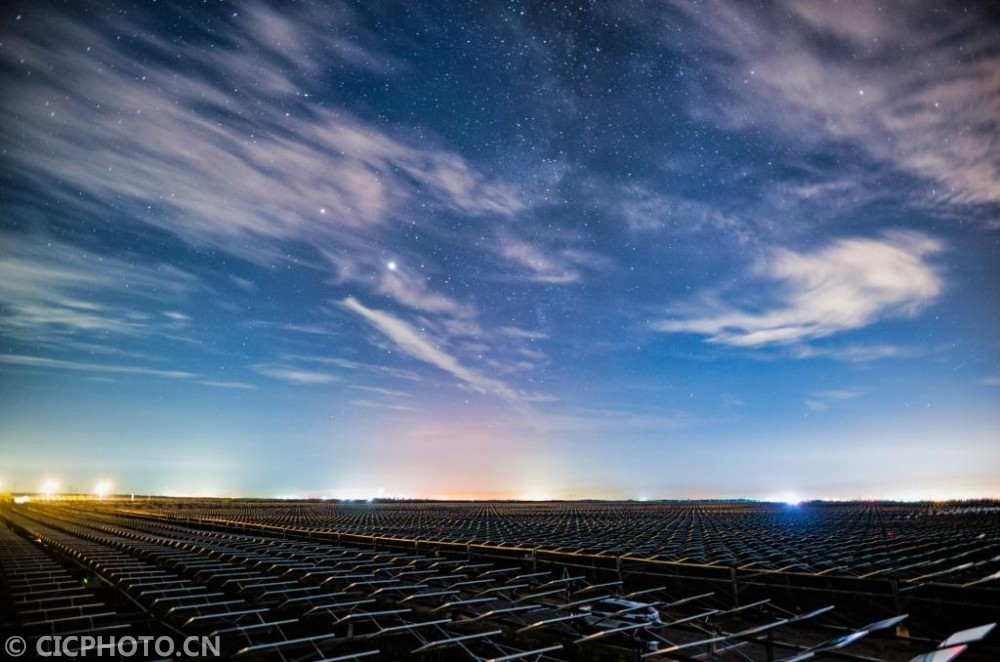 ↑2020年8月13日在宁夏银川一光伏基地拍摄的梦幻星空。CICPHOTO/董明 摄