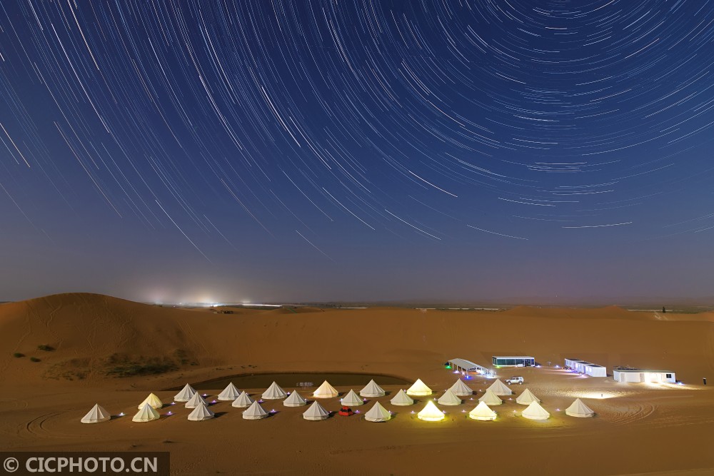 ↑2020年8月1日,在内蒙古腾格里沙漠仰望星空(多张叠加拍摄)。CICPHOTO/黄浩书 摄