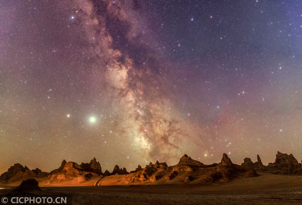 ↑2020年8月8日拍摄的青海俄博梁雅丹上空的银河星空。CICPHOTO/赵唐胤庆 摄