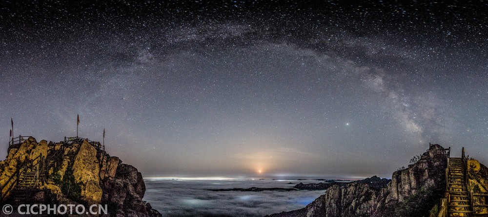↑2020年5月16日,山东烟台天崮山,月色渐起,云海蒸腾。CICPHOTO/王联兴 摄