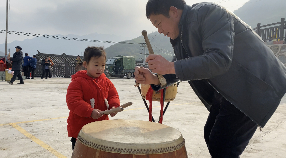 田复跃在教小孩敲鼓。 曾祥辉 2020年12月31日摄
