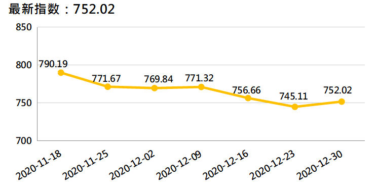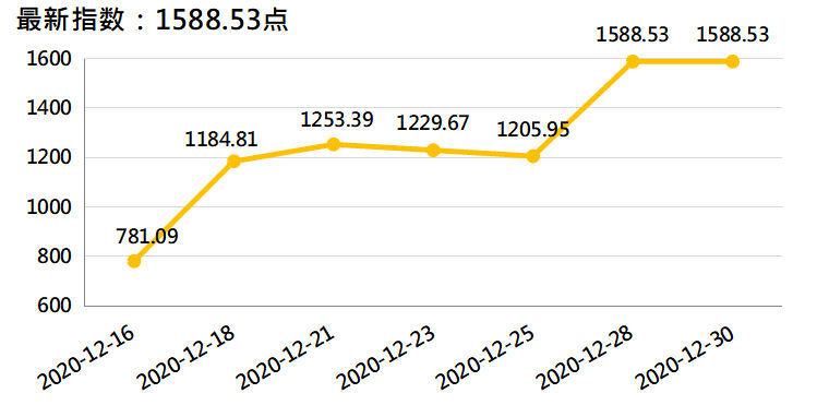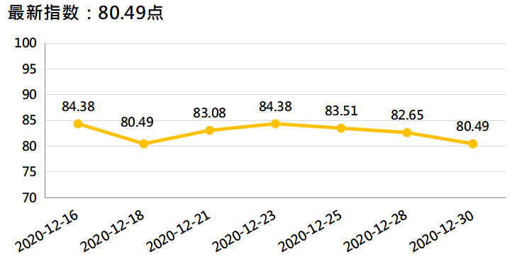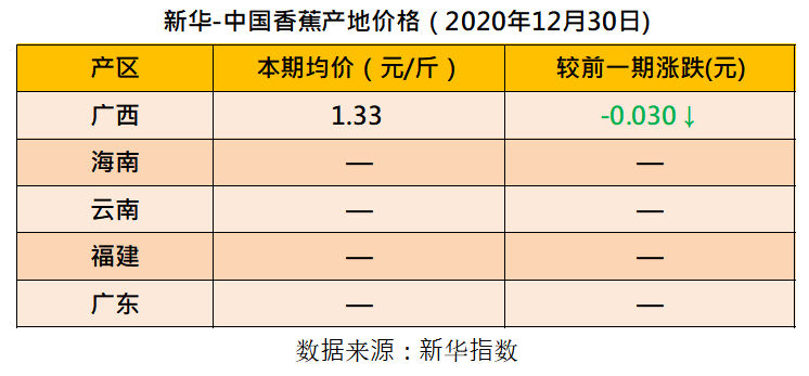 新华财经北京12月31日电(李水艳、李伯罧、薛志烜)新华-中国香蕉产业四大指数显示,截至2020年12月30日,国内香蕉产地价格指数报80.49点,较上一发布日(2020年12月23日,下同)84.38点下跌4.61%;香蕉销地批发价格指数报97.77点,较上一发布日96.42点上涨1.40%;进口蕉价格指数报752.02点,较上一发布日745.11点上涨0.93%;皇帝蕉产地价格指数报1588.53点,较上一发布日1229.67点上涨29.18%。