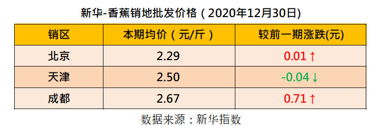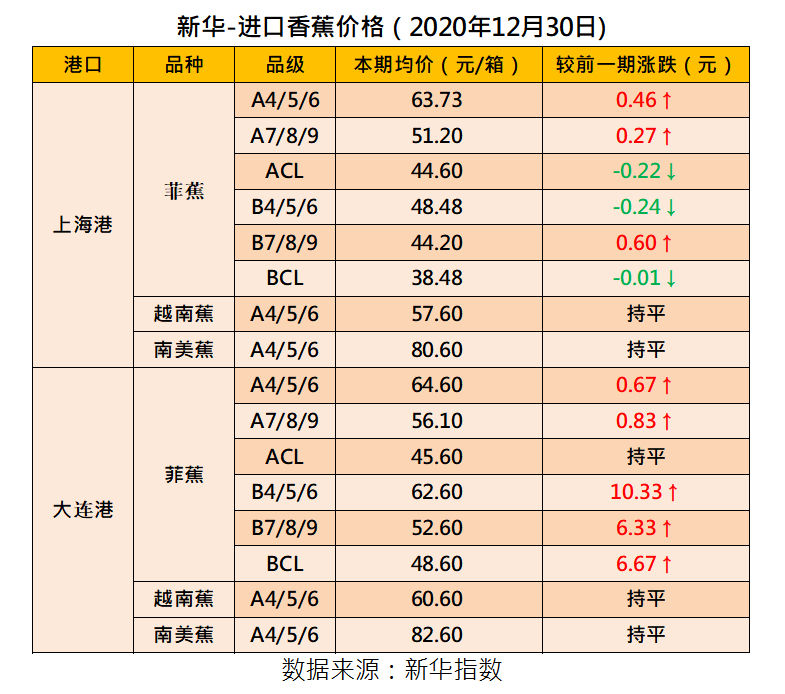 本监测期内(2020年12月24日-12月30日),皇帝蕉产地价格仍然呈现上涨态势。当前全国大部分地区受寒潮影响出现明显降温,海南皇帝蕉主产区成熟期变长导致产品供货期延长,市场供应减少,双节临近需求增加,在多重因素影响下皇帝蕉价格持续上涨,目前已达年内最高水平。销地批发市场方面,当前市场香蕉货量充足,节日将近,需求小幅增长,蕉价窄幅震荡上行。进口蕉方面,本期大连港蕉价呈现上涨态势,上海港蕉价涨跌参半,进口蕉价整体小幅回升。