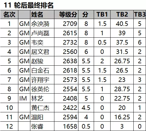 该轮过后,余泱漪、韦奕和卢尚磊同积8分,经过计算小分,余泱漪摘得冠军,卢尚磊亚军,韦奕位列第三。