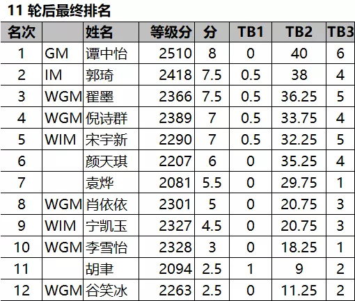 该轮比赛中,郭琦战胜李雪怡,宋宇新和倪诗群打平,翟墨胜了肖依依,郭琦和翟墨同积7.5分,比较小分,郭琦获得亚军。