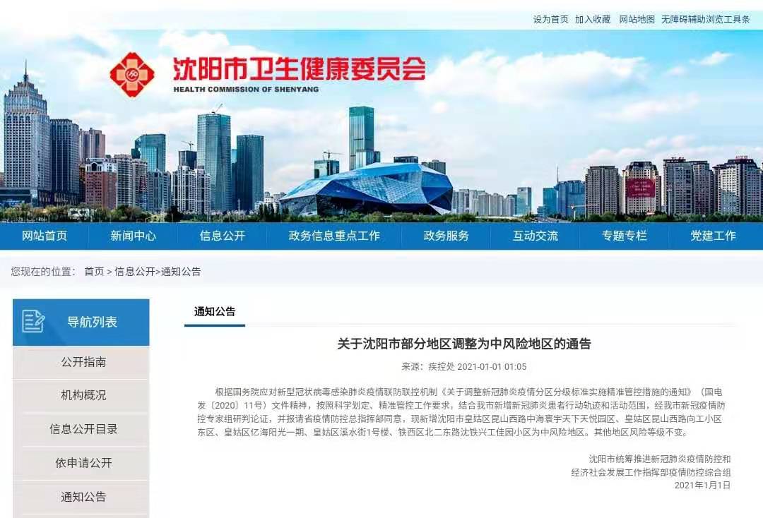 1月1日,沈阳市统筹推进新冠肺炎疫情防控和经济社会发展工作指挥部疫情防控综合组发布通告,根据国务院应对新型冠状病毒感染肺炎疫情联防联控机制《关于调整新冠肺炎疫情分区分级标准实施精准管控措施的通知》(国电发〔2020〕11号)文件精神,按照科学划定、精准管控工作要求,结合沈阳市新增新冠肺炎患者行动轨迹和活动范围,经沈阳市新冠疫情防控专家组研判论证,并报请辽宁省疫情防控总指挥部同意,现新增沈阳市皇姑区昆山西路中海寰宇天下天悦园区、皇姑区昆山西路向工小区东区、皇姑区亿海阳光一期、皇姑区溪水街1号楼、铁西区北二东路沈铁兴工佳园小区为中风险地区。其他地区风险等级不变。