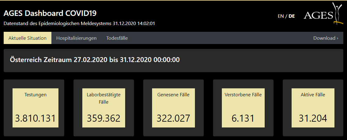 当地时间2020年12月31日14时,奥地利卫生部数据显示,过去24小时该国新增新冠肺炎确诊病例3011例,累计确诊359362例;新增死亡病例45例,累计死亡6131例;累计治愈322027例。