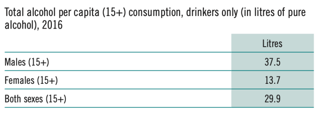 根据2018年世界卫生组织发布的《酒精与健康状况研究报告》,酒精已经被确定是诱发不同形式伤害的一个重要危险因素。它会使人遭受诸如交通事故、溺水、烧伤带来的非故意伤害和自杀、家庭暴力等形式的故意伤害。报告研究了2016年世界各国全年饮酒的情况,显示2016年全球范围消费的蒸馏酒最多(占年均总量44.8%),其次是啤酒(占年均总量34.3%),然后是葡萄酒(占年均总量11.7%),最后是其他酒精饮料。而在南非,2016年的数据是啤酒最受欢迎,占到年均消费总量的56%,蒸馏酒和葡萄酒占比皆是18%。报告对南非2016年酒类消费的调查同时显示,南非15岁以上喝酒的男性消费者人均相当于一年喝掉37.5升的纯酒精,15岁以上女性消费者喝掉的量是13.7升纯酒精,男女平均消耗量在29.9升。南非在2016年消费者年度酒精消耗量上全球排名第六,也证明了南非人对喝酒的喜爱。