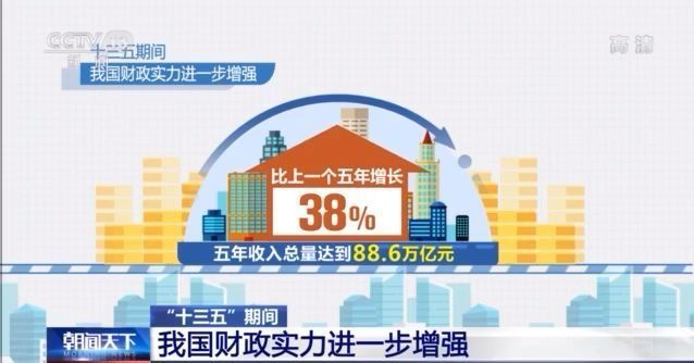 数据显示,“十三五”期间,我国财政实力进一步增强,五年收入总量达到88.6万亿元,比上一个五年增长38%。