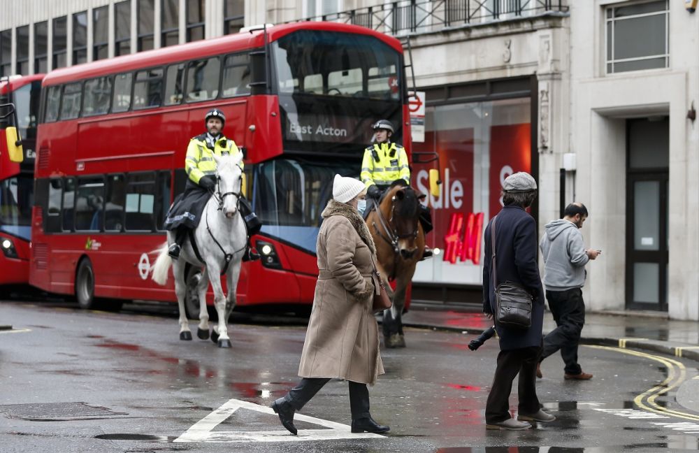 2020年12月21日,人们从英国伦敦街头巡逻的骑警旁走过。(新华社记者韩岩摄)