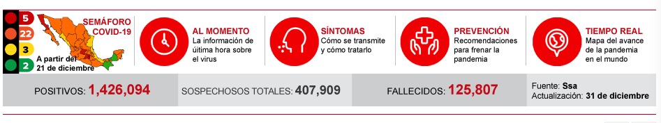当地时间2020年12月31日,墨西哥卫生部宣布,截至12月31日晚7时,墨西哥新增新冠肺炎确诊病例12159例,累计确诊1426094例;新增死亡病例910例,累计死亡125807例。(总台记者 盛嘉迪 吕兴林)