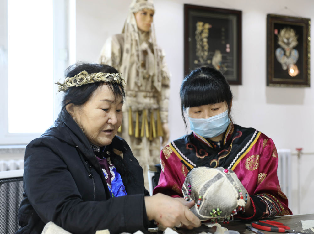 ↑国家级赫哲族鱼皮制作技艺传承人尤文凤(左一)在教授鱼皮制作技艺。新华社记者王春雨 摄