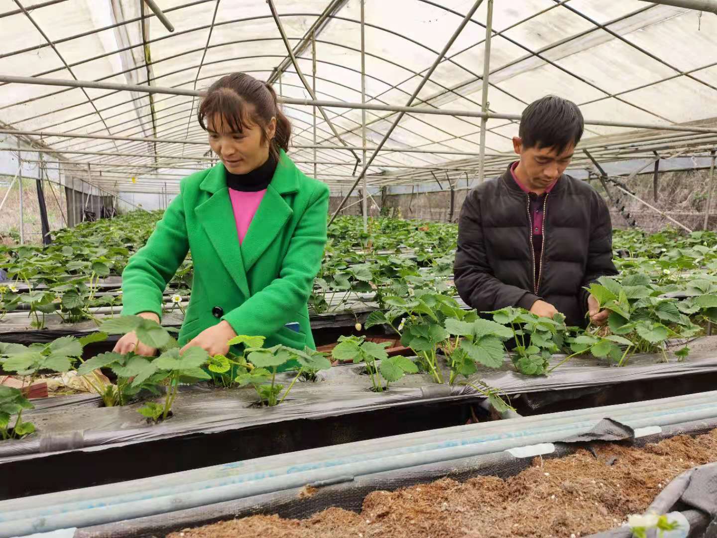 张贵相和丈夫在修剪草莓苗 新华社记者 宋晨 摄