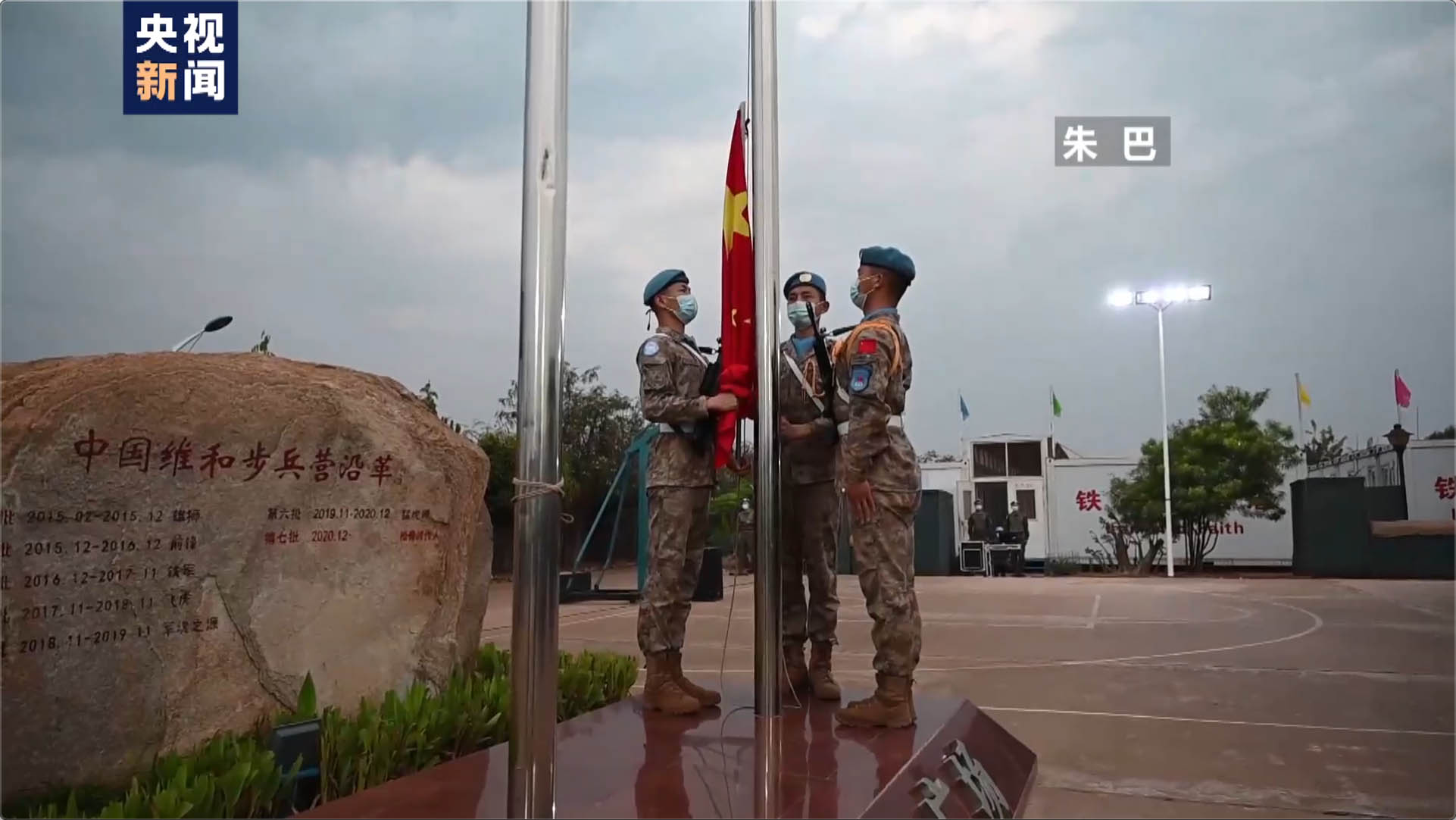 当地时间1月1日,远在非洲执行维和任务的维和官兵,在南苏丹朱巴和瓦乌的中国营举行升旗仪式迎接新年的到来。