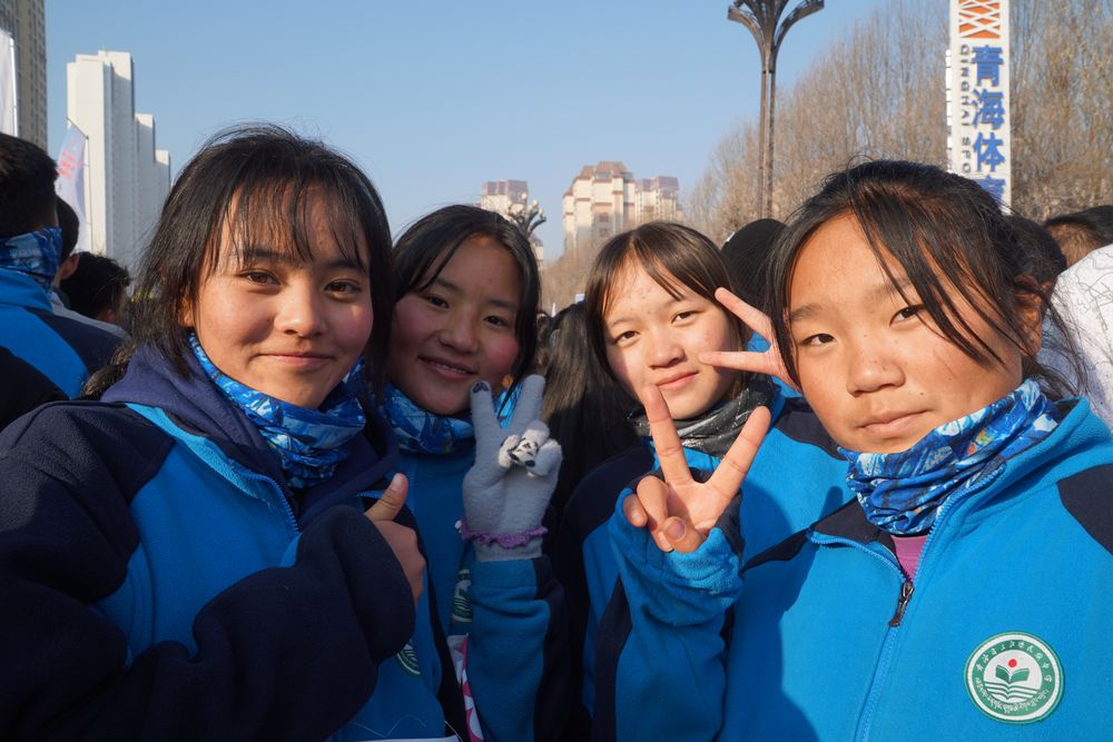 起跑线附近,洁泽和伙伴们做着准备活动。洁泽是青海省三江源民族中学的高一学生,扎着辫子的她,在学校里是一名运动达人。“学校有各种各样的体育活动。除了跑800米,我也很爱打篮球。”洁泽说。