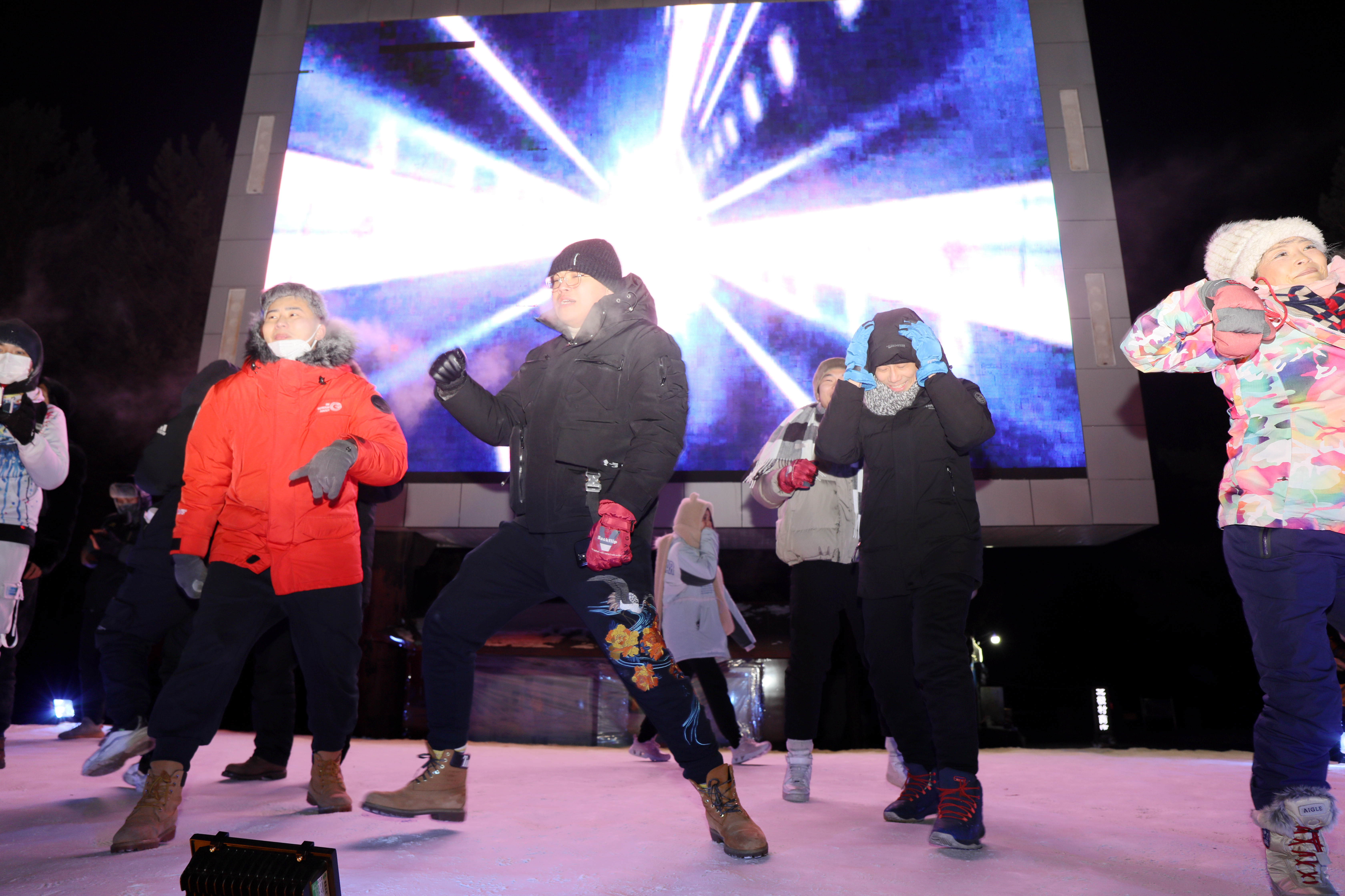 1日凌晨,游客们参加北极村跨年活动。