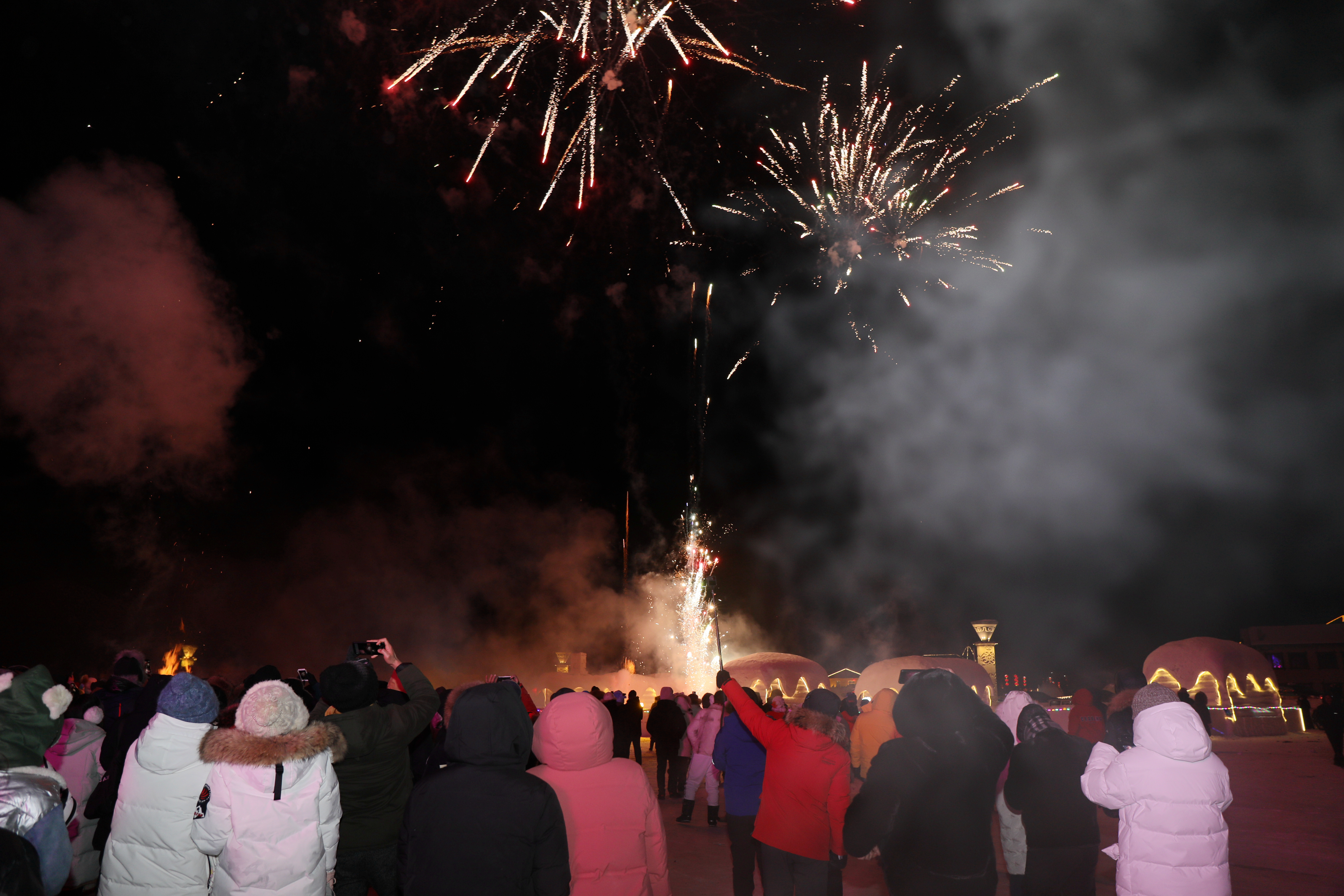 夜色降临,游客们欢聚在北极村七星广场,共同等待新年到来。全场倒计时响起,绚丽烟花冲天而起,来自全国各地的游客一同大声倒数,在欢声笑语中送别2020年,迎接2021年的到来,在漫天烟花中许下新年的美好愿望。