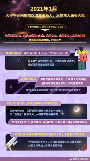 【#2021年第一场流星雨1月3日光临地球#】2021年第一场流星雨——象限仪流星雨1月3日将迎来峰值,送上浪漫的新年祝福。天文专家提醒,我国感兴趣的公众可在3日深夜至4日凌晨进行观测。