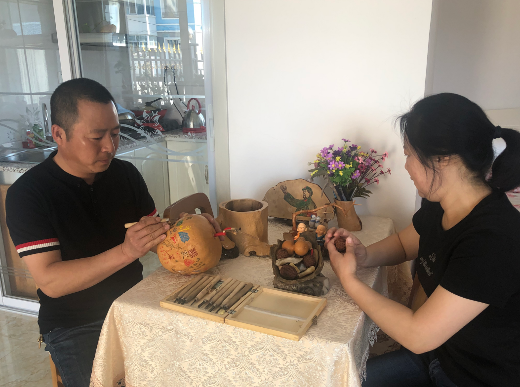 杨雨茁专心致志用刻刀雕刻木雕作品,妻子用砂纸打磨桃木 图片来源:全国妇联