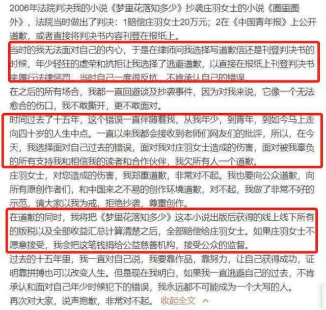 郭敬明于2020年的最后一天,就当年的《梦里花落知多少》抄袭事件发文向庄羽道歉,表示要将小说出版后获得的版税以及全部收益赔偿给庄羽。随后,庄羽也表示接受这份迟来的歉意,并提议将《圈里圈外》《梦里花落知多少》两本书的收益合并在一起成立一个反剽窃基金,用以帮助原创作者维权。