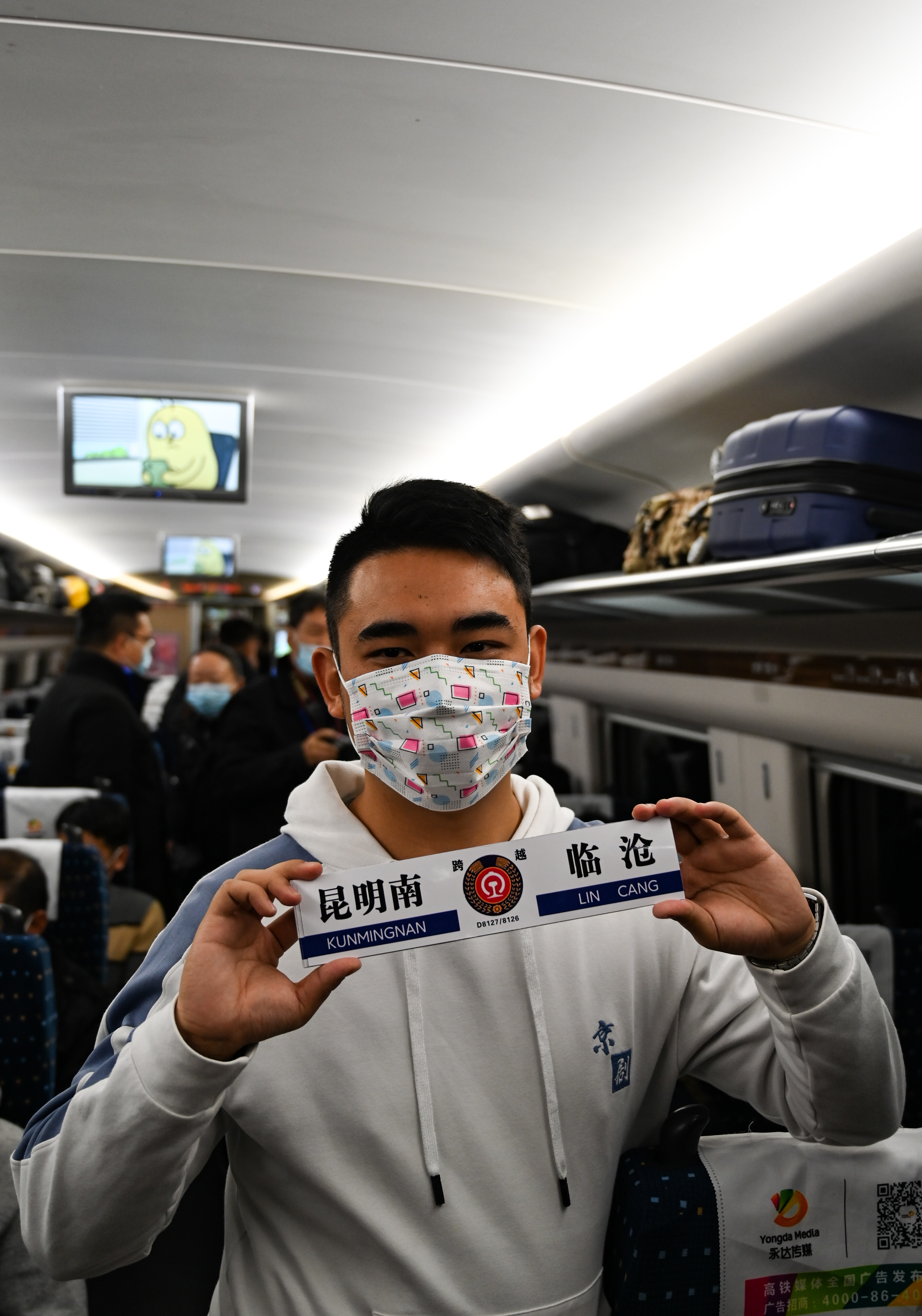 2020年12月30日,一名乘客在昆明南至临沧的D8127次列车上手持自制纪念品留影。新华社记者 王冠森 摄