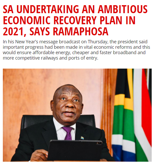 当地时间1月1日,据南非当地媒体报道,南非总统拉马福萨在新年伊始贺词中宣布南非将通过能源,宽带,铁路和港口的发展带动南非2021年经济的腾飞。