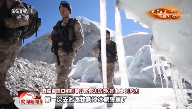 西藏军区日喀则军分区某边防团6连上士 刘凤杰:他们(不法分子)认为这边山高,巡逻或者管控的力度会弱一些。许多违法犯罪分子就选择铤而走险,走我们兰巴拉山口。 第一次去巡逻我就掉冰窟窿里了,我明明看着一块冰是好的,结果我一踩上去它一下就垮了,步枪它横在我胸前刮了一下,然后水的话就只冒到这里,如果一直往下掉的话,我也不知道它有多深。那个水,哎呀,怎么说呢,反正就这辈子从来也没见过那么冷的水了,特别冷,特别刺骨。