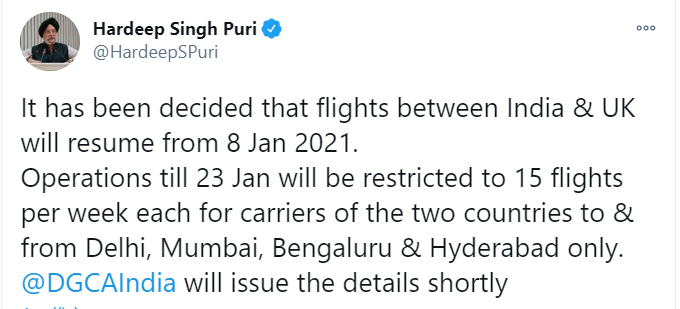 印度民航部长哈迪普·辛格·普里(HardeepSinghPuri)1日表示,从1月8日起,印度将有条件地开放印度往返英国的航班。普里在社交媒体上说,从1月8日到23日,印度往返英国的航班每周限制在15个班次, 只限印度的新德里、孟买、班加罗尔和海德拉巴等城市与英国通航。(总台记者 王建兵)
