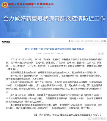 截至2021年1月1日24时,据31个省(自治区、直辖市)和新疆生产建设兵团报告,现有确诊病例383例(其中重症病例10例),累计治愈出院病例82076例,累计死亡病例4634例,累计报告确诊病例87093例,现有疑似病例1例。累计追踪到密切接触者906634人,尚在医学观察的密切接触者14311人。