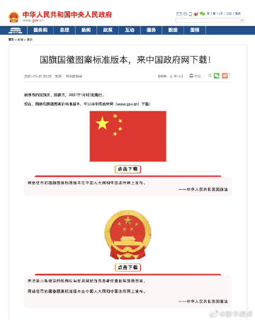 【#国旗国徽图案标准版本来啦#】新修改的国旗法、国徽法,2021年1月1日起施行。现在,国旗和国徽图案的标准版本,可以去中国政府网(www.gov.cn)下载。