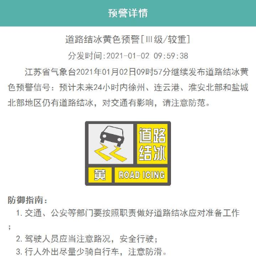 江苏继续发布道路结冰黄色预警信号