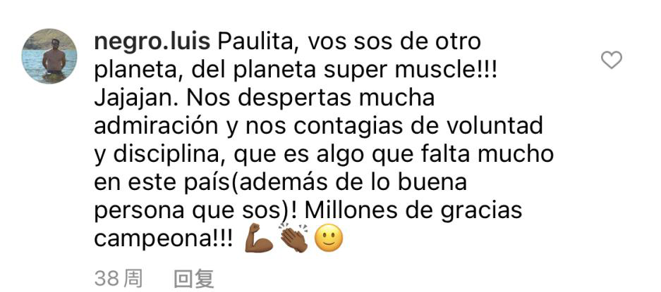 △网友:宝拉,你是来自另一个叫超级肌肉星球的吧!你让我们赞叹不已,你教会了我们意志力和自律。这可能正是我们国家缺少的。不尽感激!