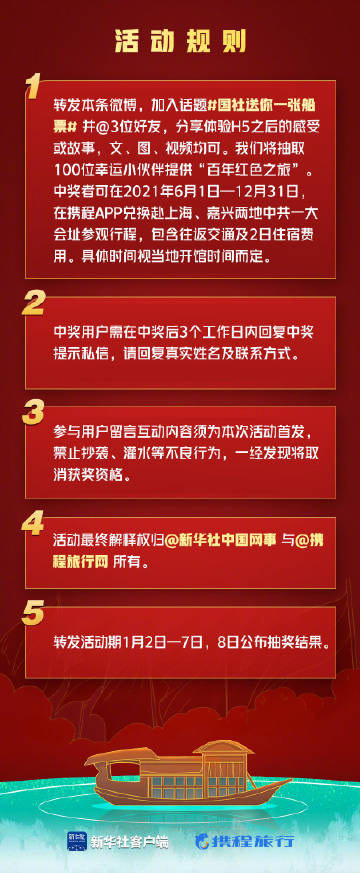 #国社送你一张船票# 穿越百年征程,转发本条微博,分享体验→O网页链接 之后的感受或故事并@3位好友,我们将为100位幸运小伙伴提供“百年红色之旅”——赴上海中共一大会址、嘉兴南湖红船,深度体验百年风雨征程。#国社送你一张船票# 穿越百年征程,转发本条微博,分享体验→网页链接 之后的感受或故事并@3位好友,我们将为100位幸运小伙伴提供“百年红色之旅”——赴上海中共一大会址、嘉兴南湖红船,深度体验百年风雨征程。活动详见海报 @新华社中国网事 @携程旅行网 @微博抽奖平台 抽奖详情