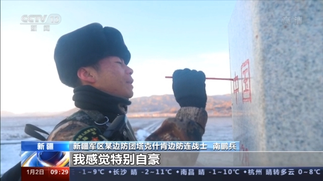 新疆军区某边防团塔克什肯边防连战士 南鹏兵:这是我第一次看见界碑,能够为祖国界碑描红,让我感觉特别自豪,这个元旦让我感觉到特别有意义。