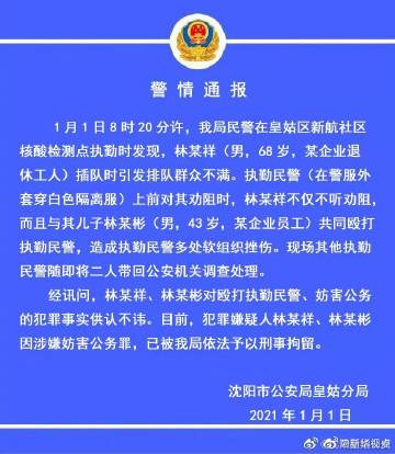 【#身穿防护服人员遭到殴打# 当地警方回应:打人者已被刑拘】一段“身穿防护服的人遭到殴打”的视频1日引发关注。沈阳市公安局皇姑分局回应称,皇姑分局执勤民警(在警服外套穿白色隔离服)在社区核酸检测点执勤时发现,林某祥插队时引发排队群众不满,上前劝阻时,林某祥与其儿子林某彬共同殴打执勤民警。目前,打人者已被刑事拘留。(记者李铮、汪伟)