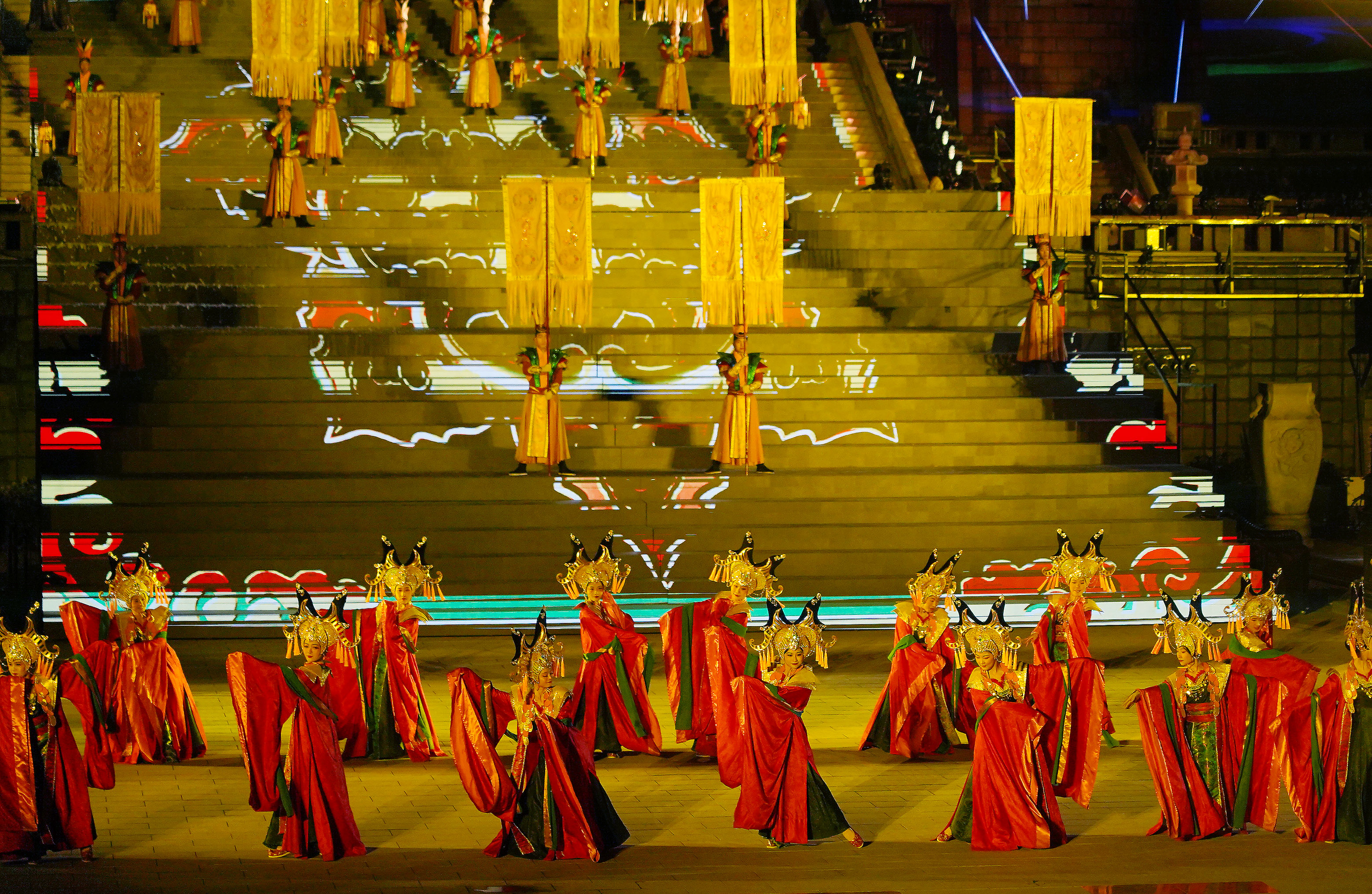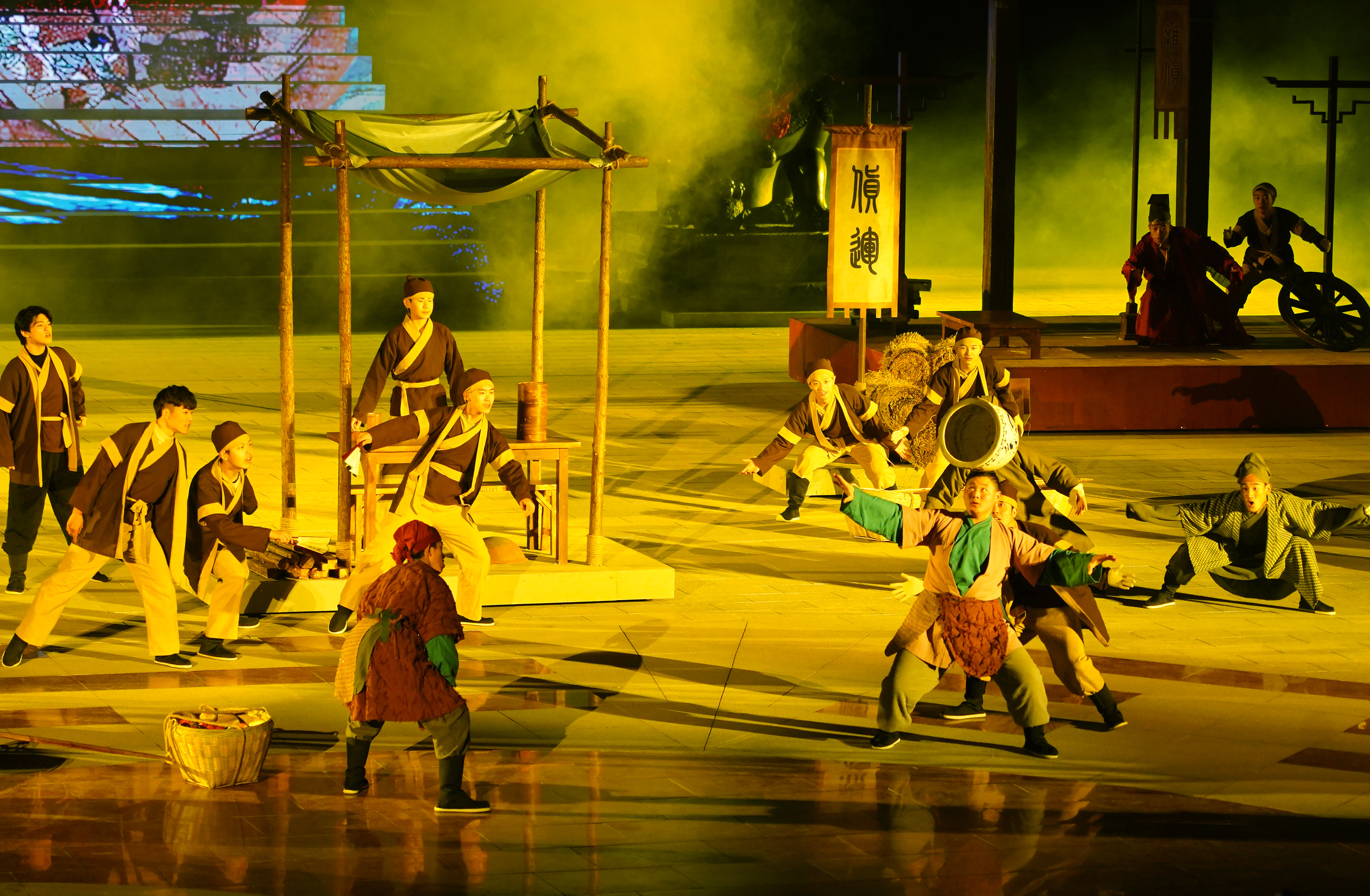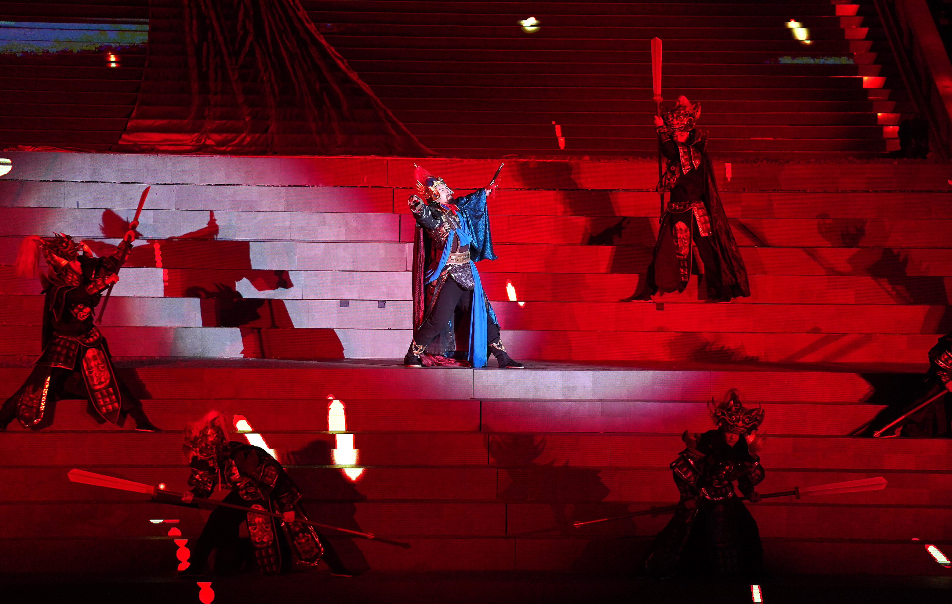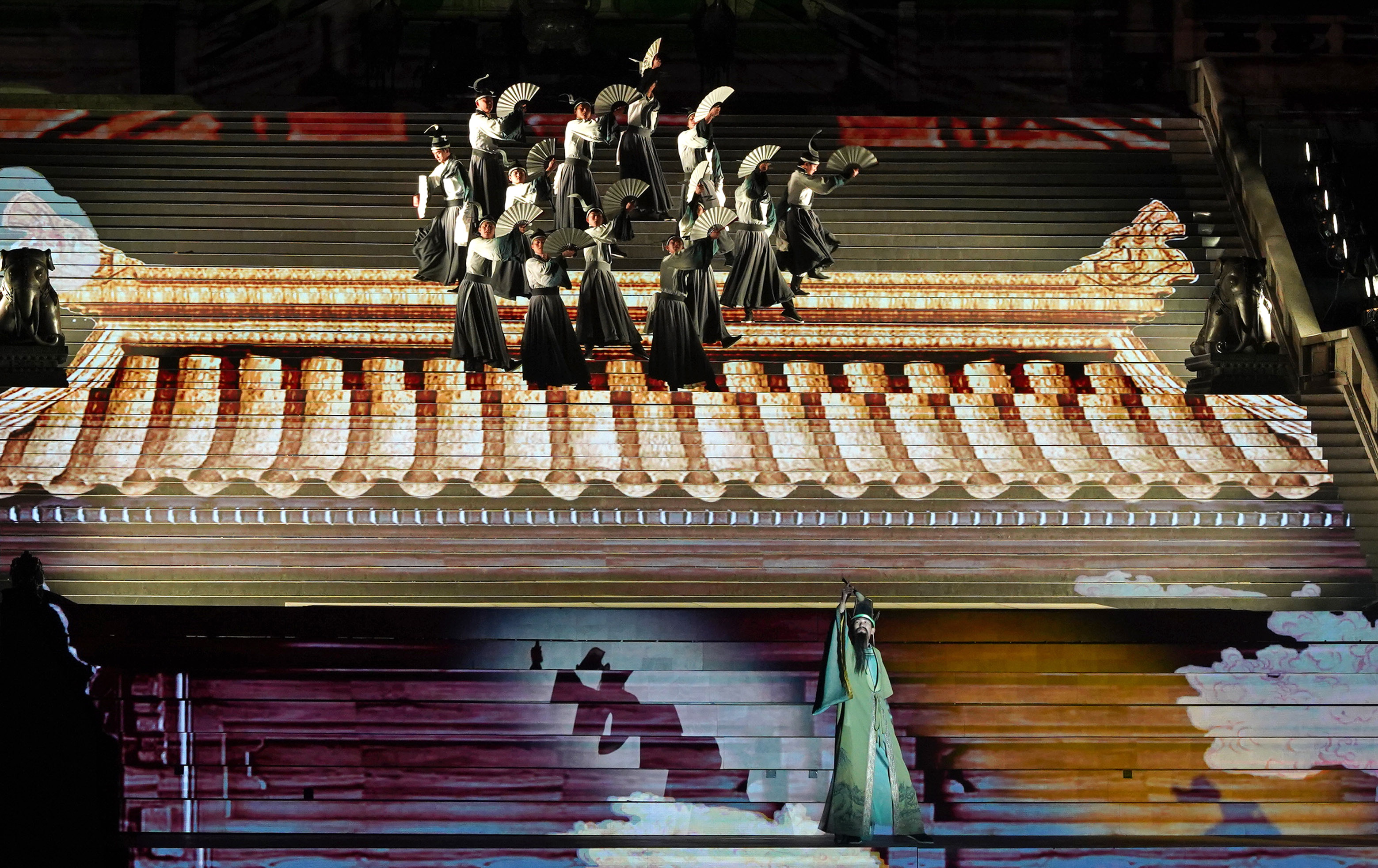 ↑演员在《寻梦滕王阁》大型实景演出现场表演(2021年1月1日摄)。