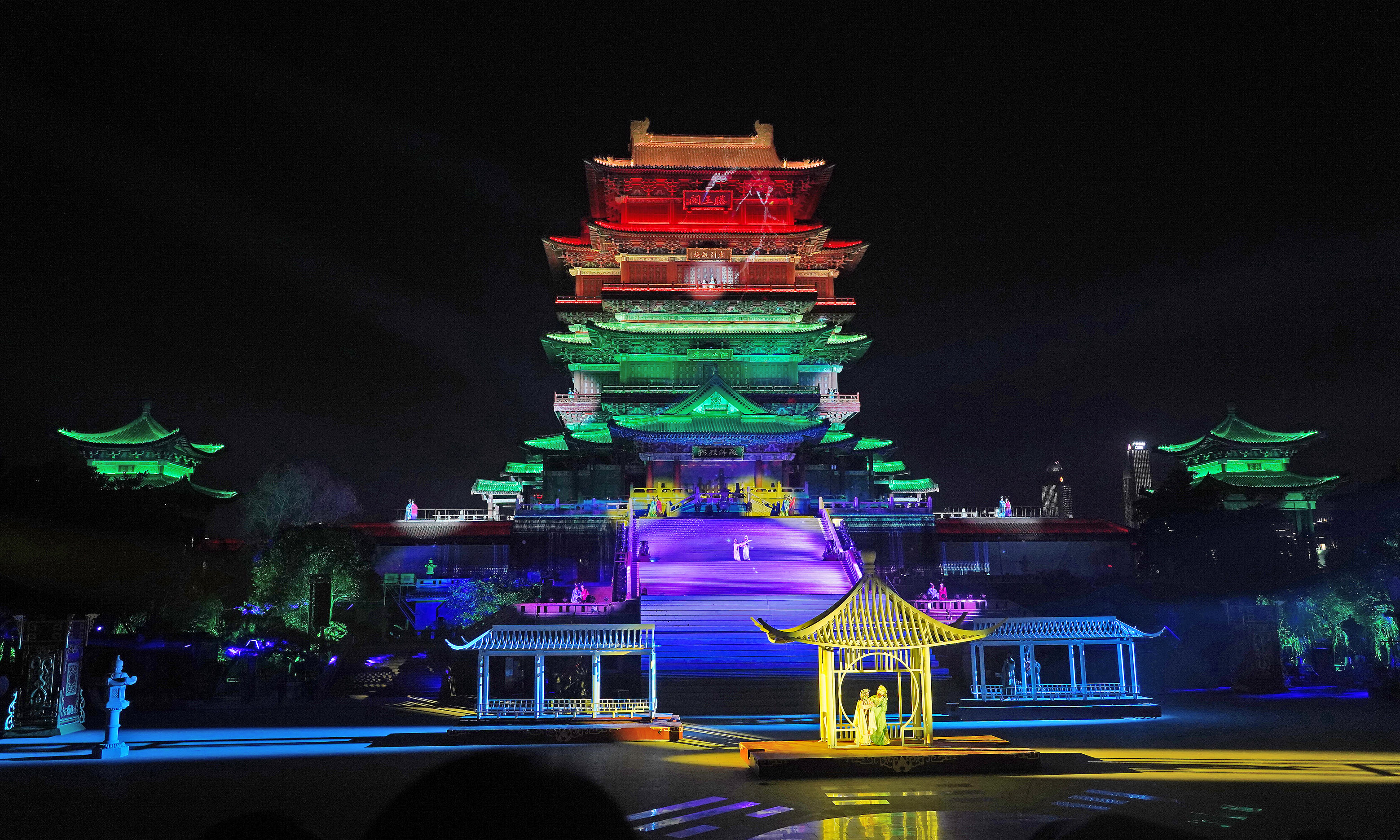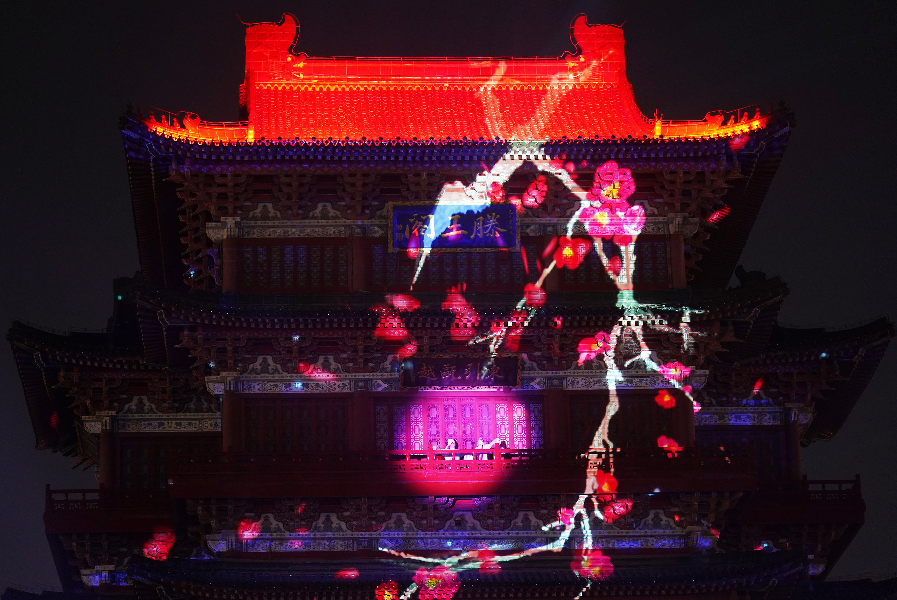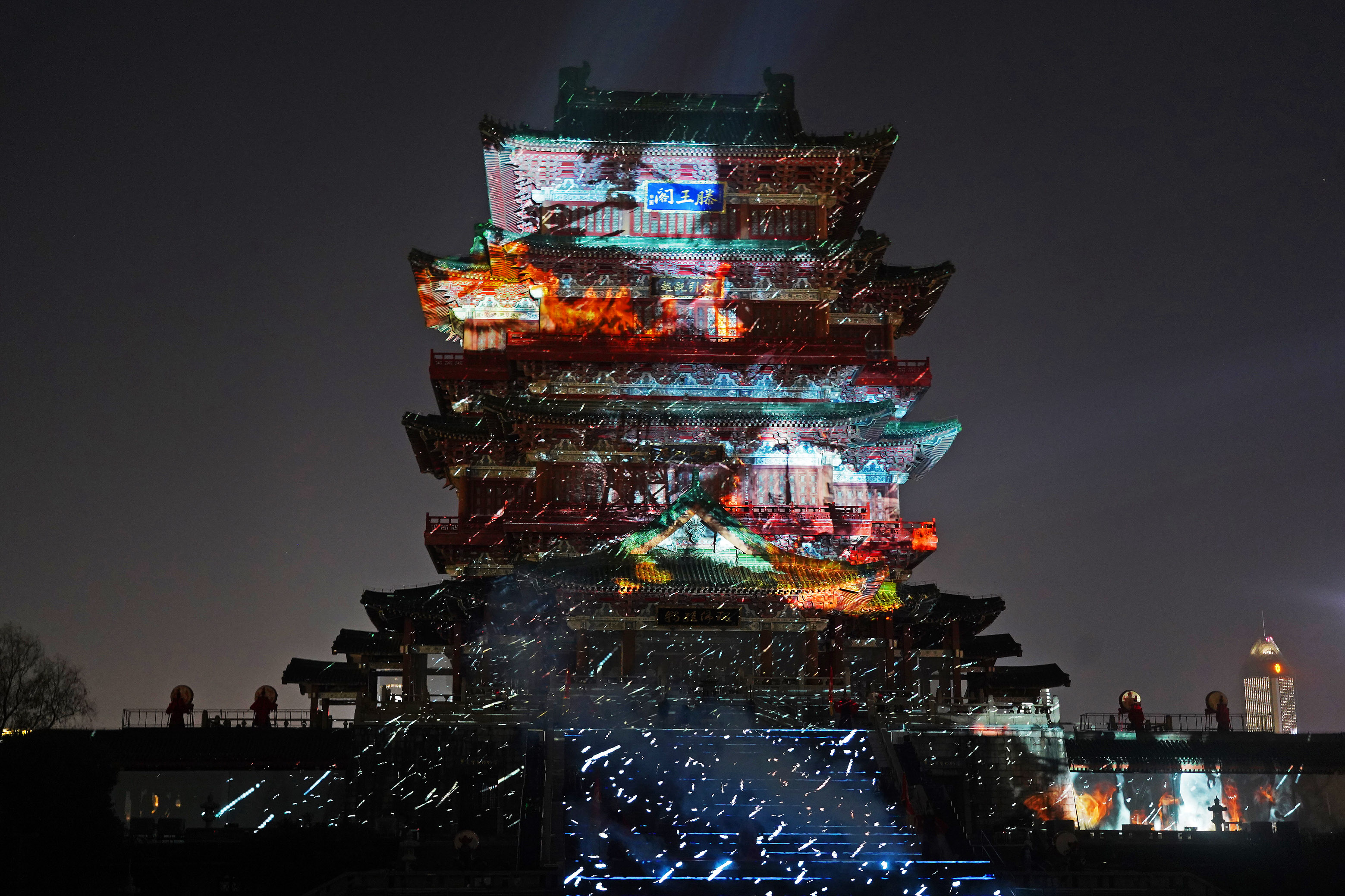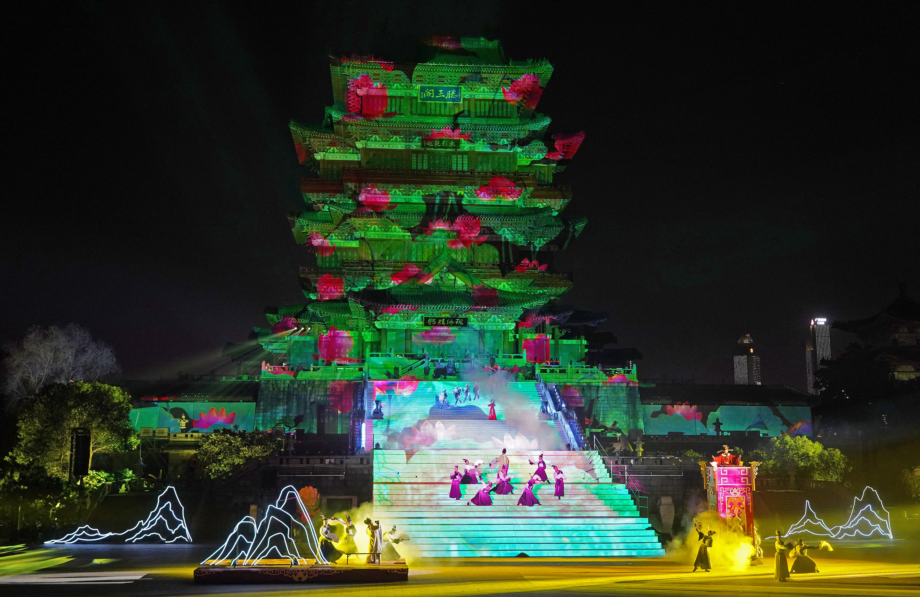 2021年1月1日晚,《寻梦滕王阁》大型实景演出在南昌滕王阁景区对外公演。《寻梦滕王阁》借助滕王阁内一阁、一廊、二间、一台的空间优势,分“七梦七境滕王阁”“游园对诗”“盛世咏唱”三个篇章,配合全息数字影像技术、大型装置投影等声、光、电艺术手法,展现了滕王阁丰富的历史文化内涵。新华社记者 万象 摄影报道