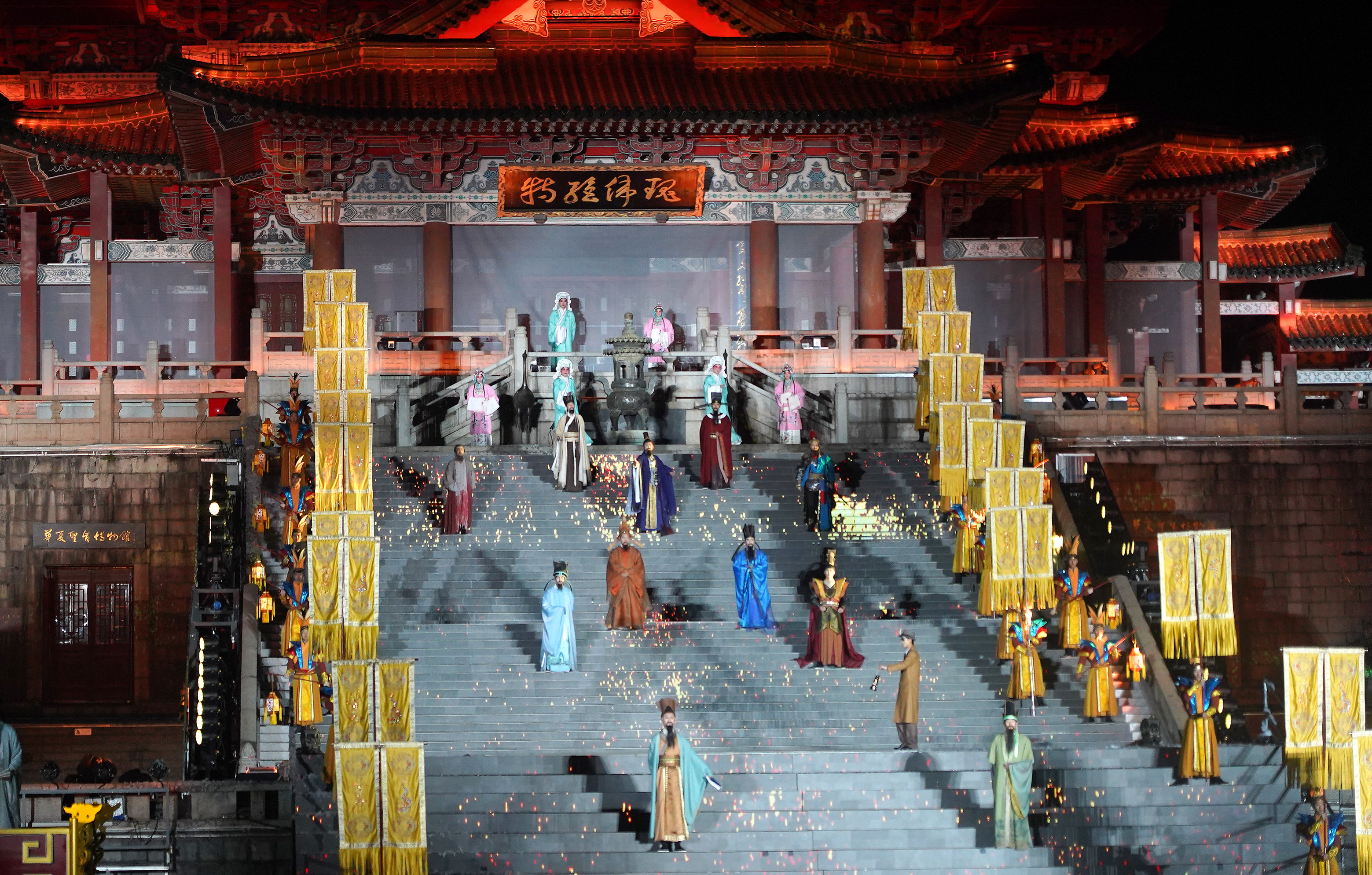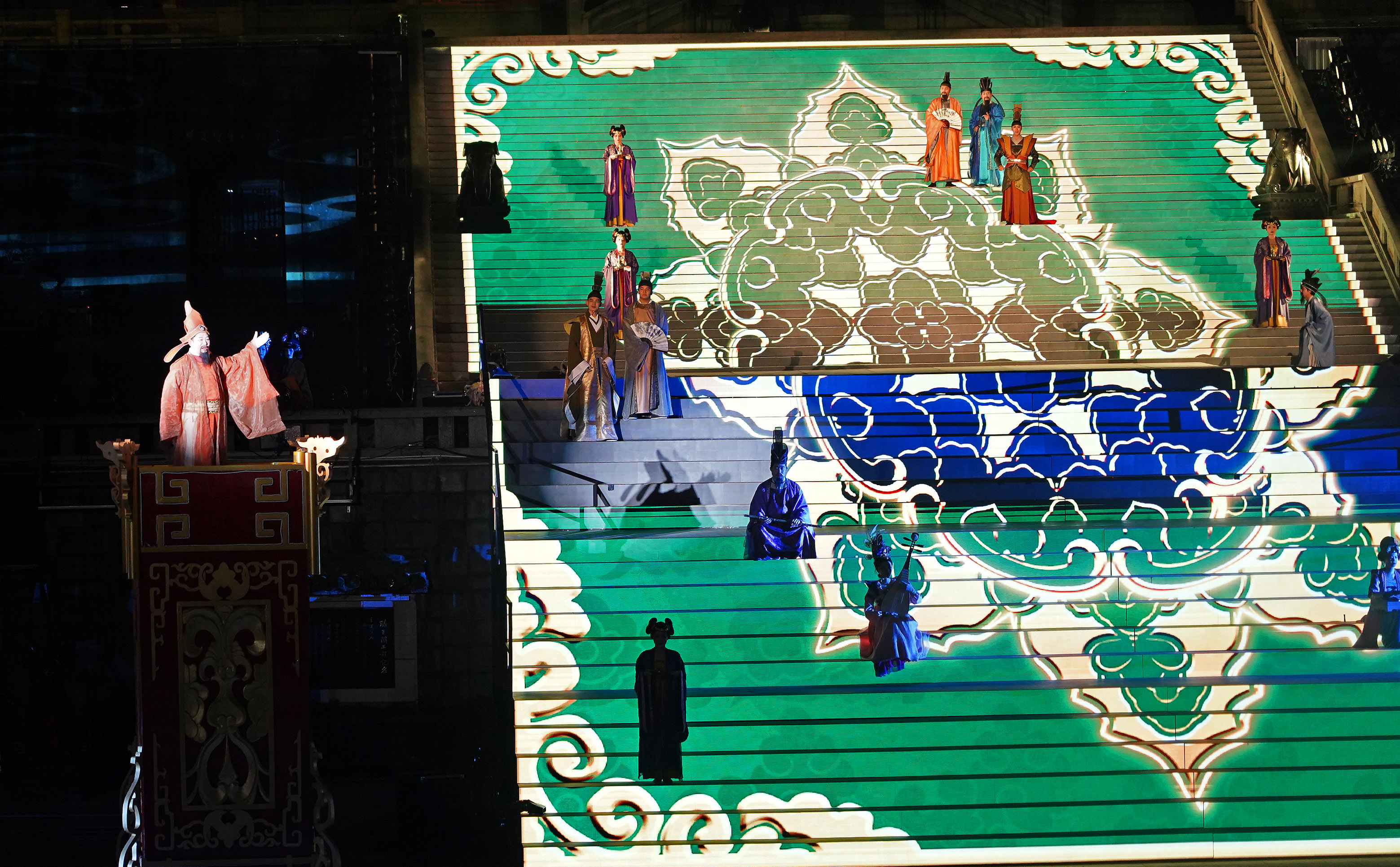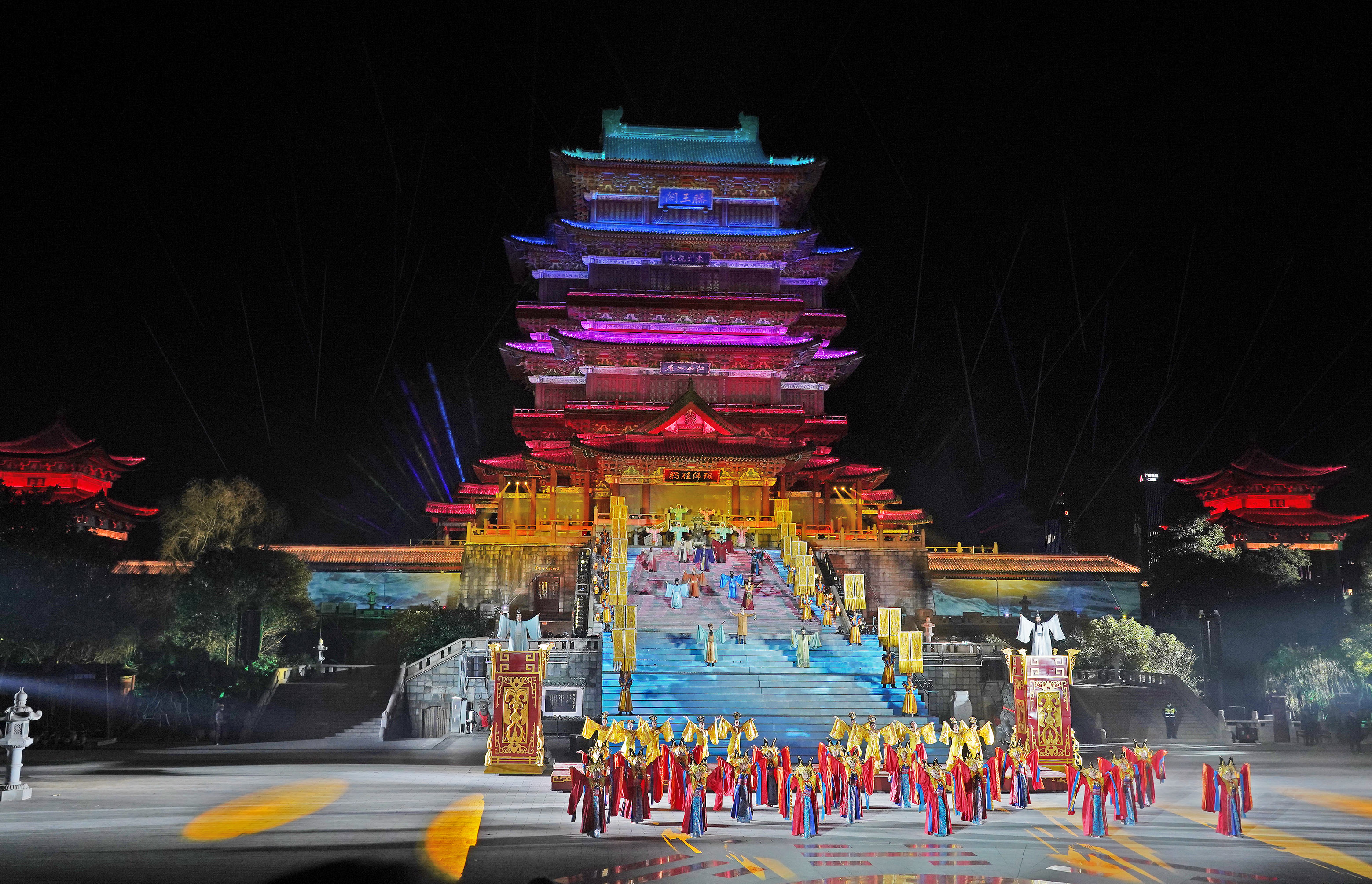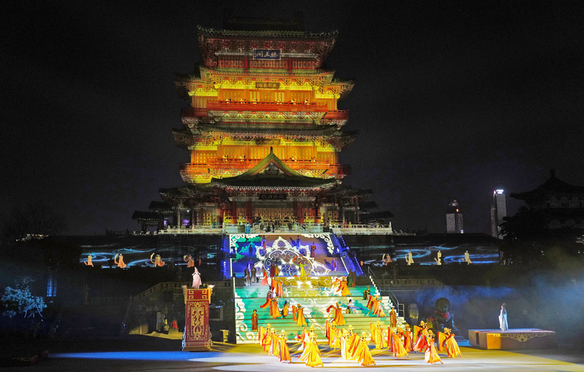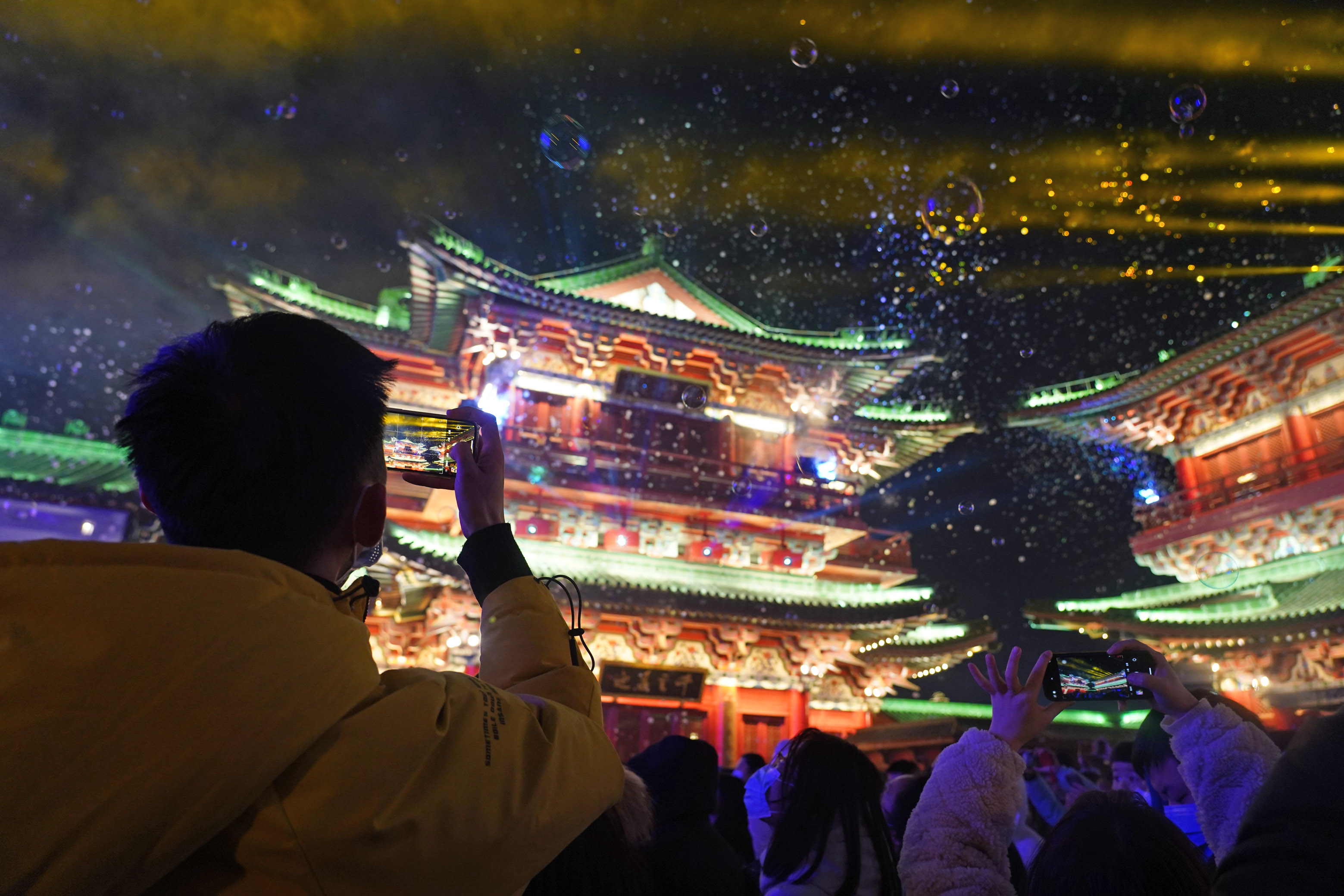2021年1月1日晚,《寻梦滕王阁》大型实景演出在南昌滕王阁景区对外公演。《寻梦滕王阁》借助滕王阁内一阁、一廊、二间、一台的空间优势,分“七梦七境滕王阁”“游园对诗”“盛世咏唱”三个篇章,配合全息数字影像技术、大型装置投影等声、光、电艺术手法,展现了滕王阁丰富的历史文化内涵。新华社记者 万象 摄影报道