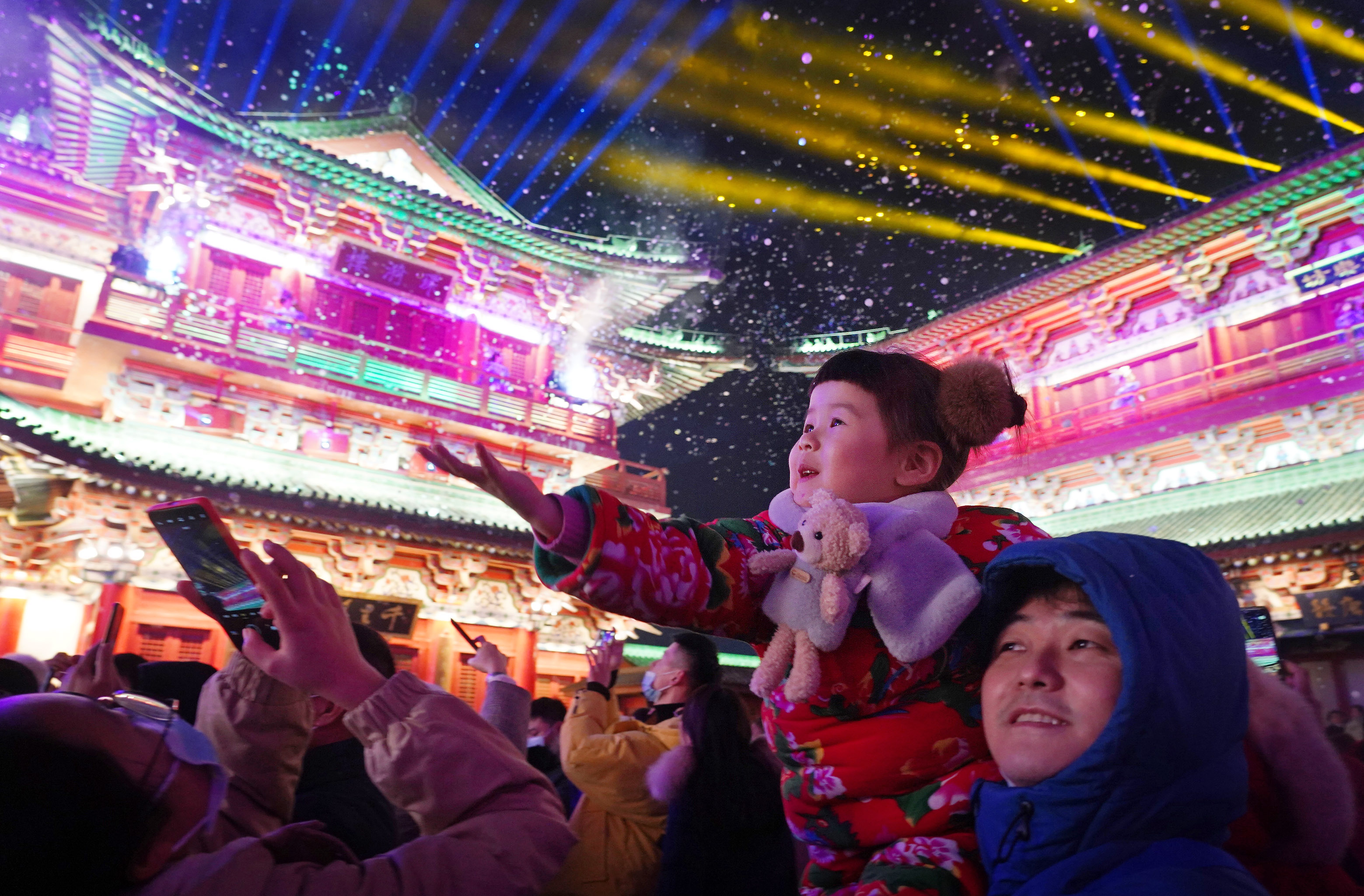↑观众在观看《寻梦滕王阁》大型实景演出(2021年1月1日摄)。