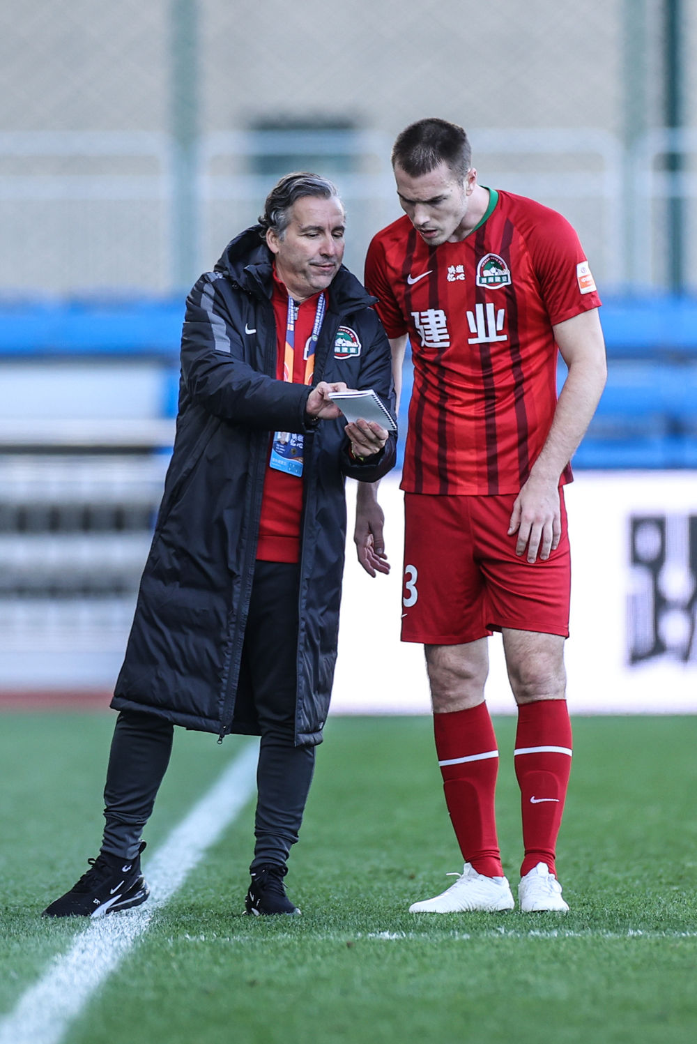 11月1日,河南建业队主教练哈维尔(左)给球员舒尼奇布置战术。新华社记者 潘昱龙 摄