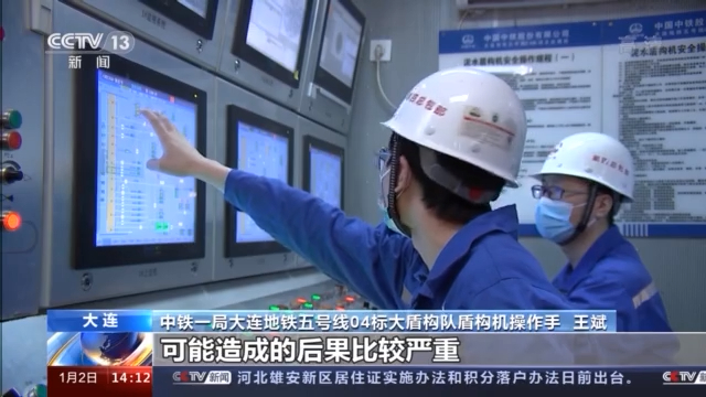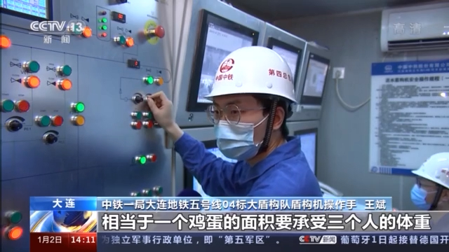 中铁一局大连地铁五号线04标大盾构队盾构机操作手 王斌:前面压力非常大,相当于一个鸡蛋的面积要承受三个人的体重,如果盾构机一旦停机,前面压力就没法恒定,可能会造成非常大的安全事故。