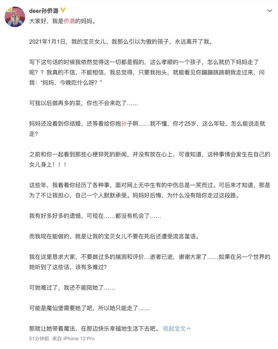 孙侨潞妈妈还表示:“我在这里恳求大家,不要做过多的揣测和评价,逝者已逝,谢谢大家了……如果在另一个世界的她听到了这些话,该有多难过?”