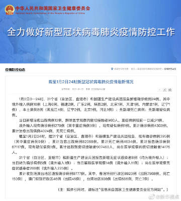 #严防疫情反弹#【国家卫健委:1月2日新增确诊病例24例】2021年1月2日0—24时,31个省(自治区、直辖市)和新疆生产建设兵团报告新增确诊病例24例,其中境外输入病例16例(上海6例,福建2例,广东2例,陕西2例,北京1例,天津1例,内蒙古1例,辽宁1例),本土病例8例(黑龙江4例,辽宁2例,北京1例,河北1例);无新增死亡病例;无新增疑似病例。
