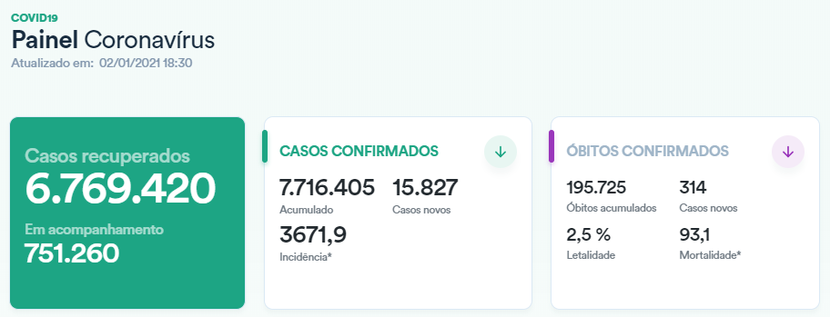截至当地时间2021年1月2日,据巴西卫生部发布的数据,该国新冠肺炎确诊病例累计达7716405例,单日新增确诊病例15827例,累计死亡病例195725例,单日新增死亡病例314例。累计康复人数6769420人。