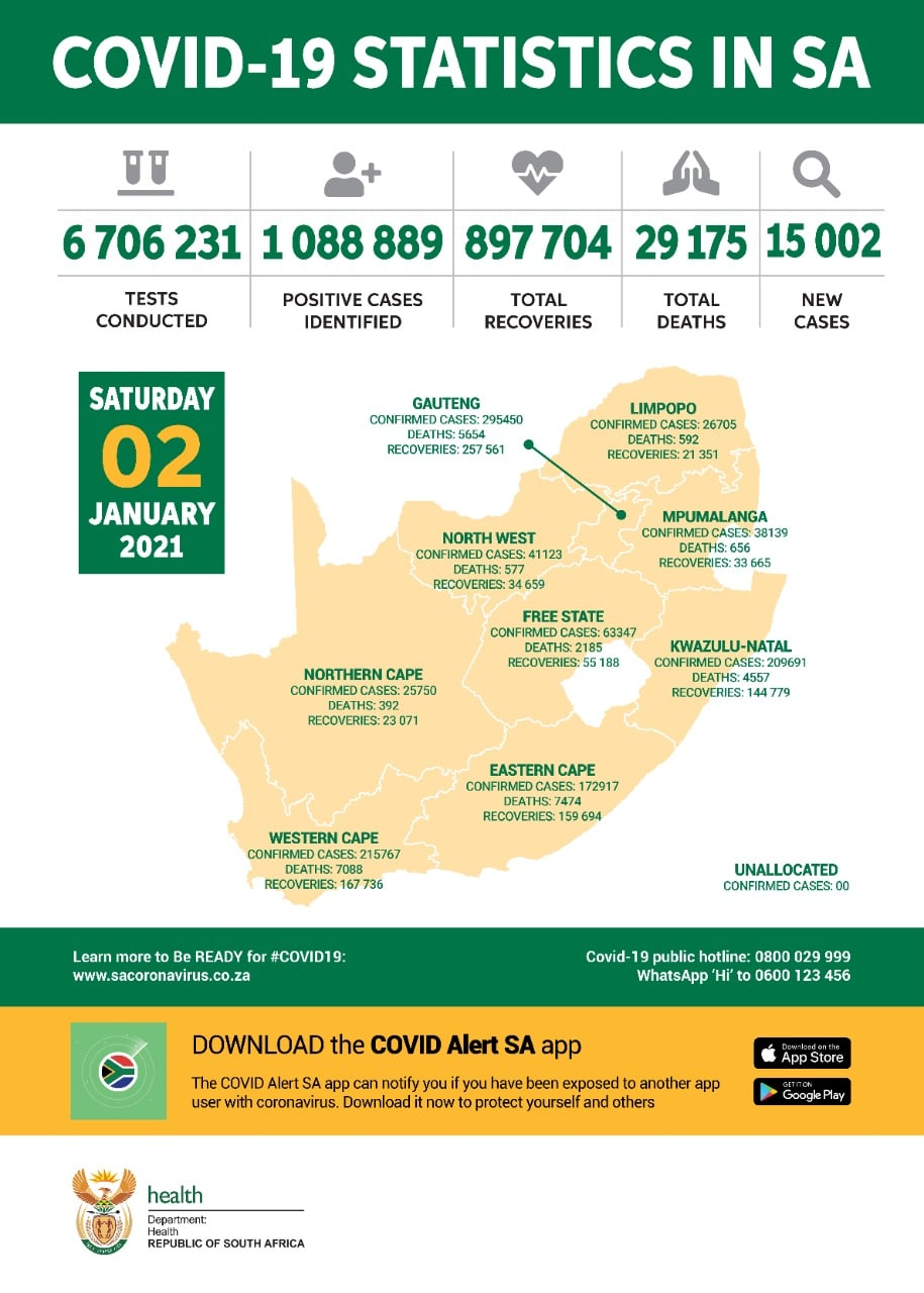当地时间1月2日,南非卫生部确认该国当天新增新冠肺炎确诊病例15002例,新冠肺炎累计确诊病例达1088889例,南非全国累计检测6659318人, 当日检测46913人。新增死亡病例288例,累计死亡达29175例。截至目前,共897704人被治愈。(总台记者 周涛)