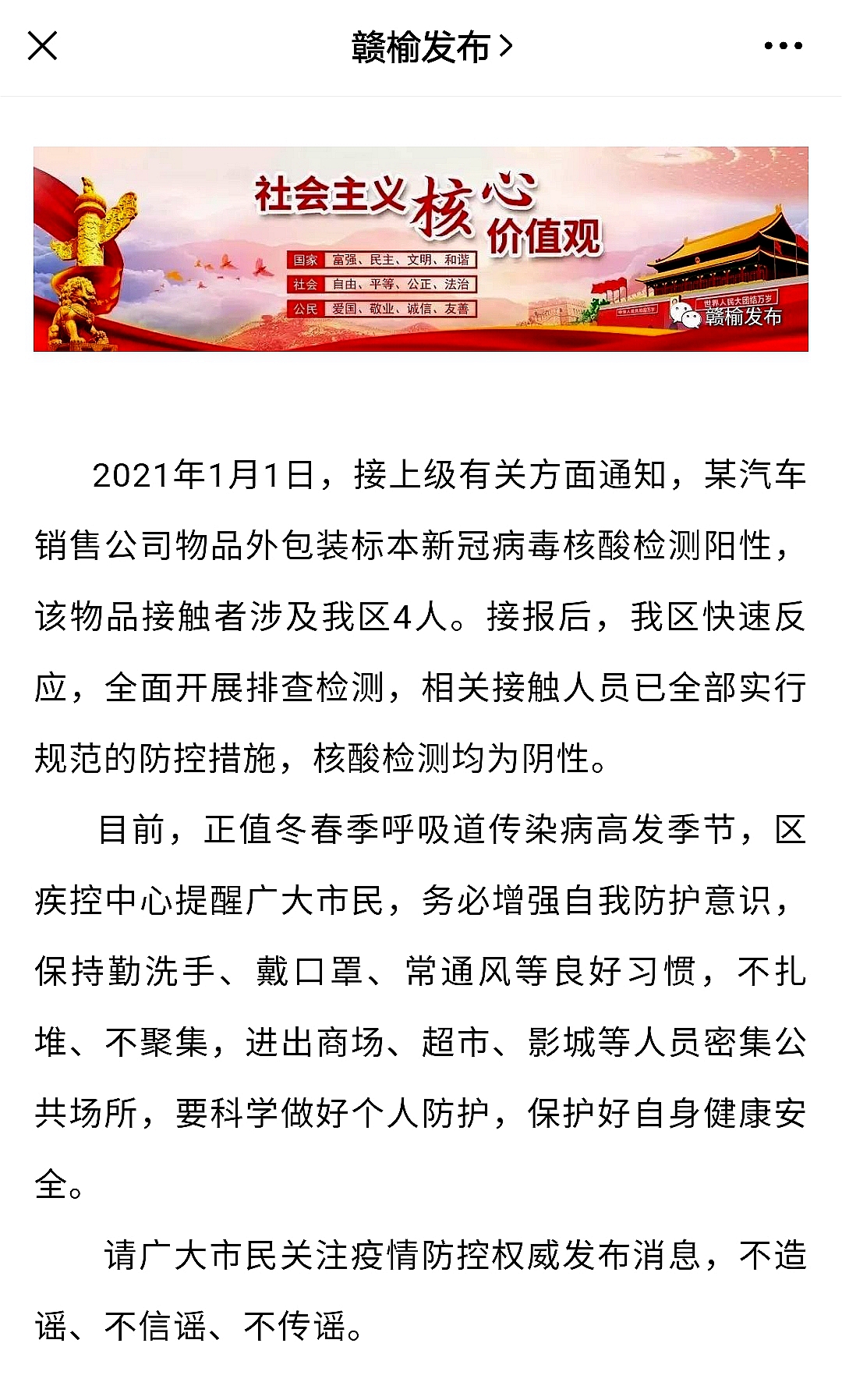 据连云港市赣榆区卫生健康委员会发布消息,2021年1月1日,接上级有关方面通知,某汽车销售公司物品外包装标本新冠病毒核酸检测阳性,该物品接触者涉及连云港市赣榆区4人。接报后,赣榆区快速反应,全面开展排查检测,相关接触人员已全部实行规范的防控措施,核酸检测均为阴性。请广大市民关注疫情防控权威发布消息,不造谣、不信谣、不传谣。